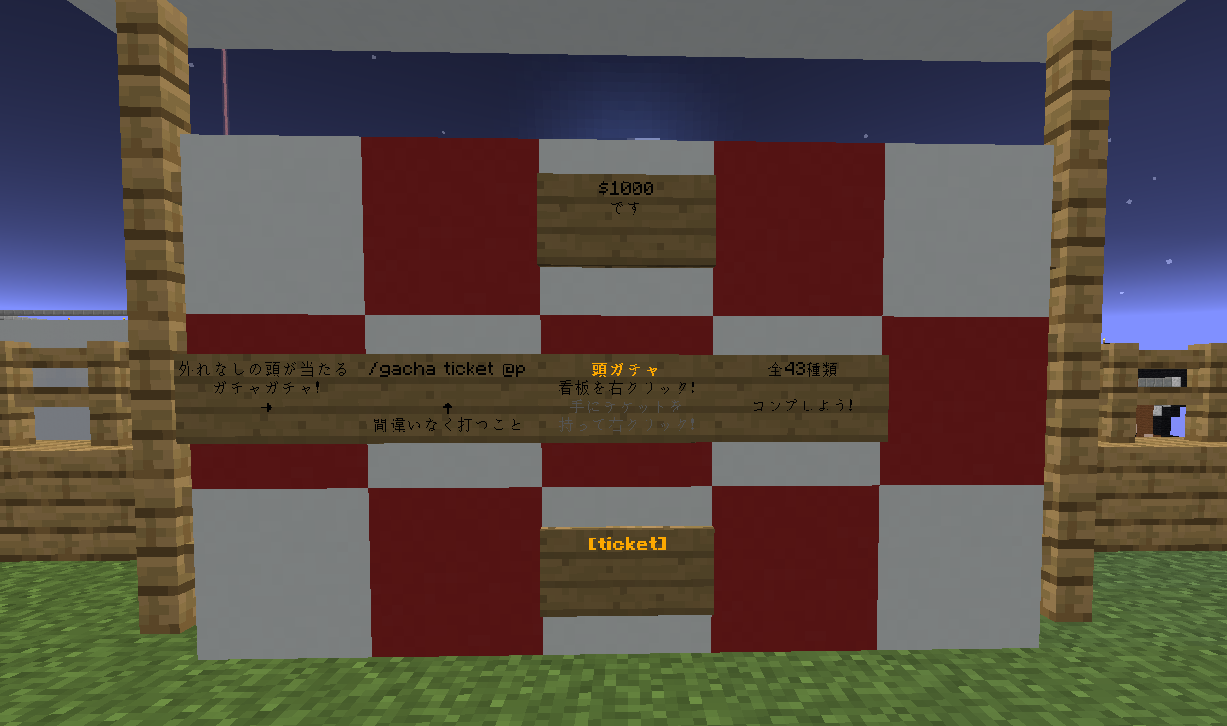 拠点ビル屋上にある、装飾用のヘッドブロックアイテムが景品になっているガチャです。(コマンド /warp gacha_atama で移動できます)