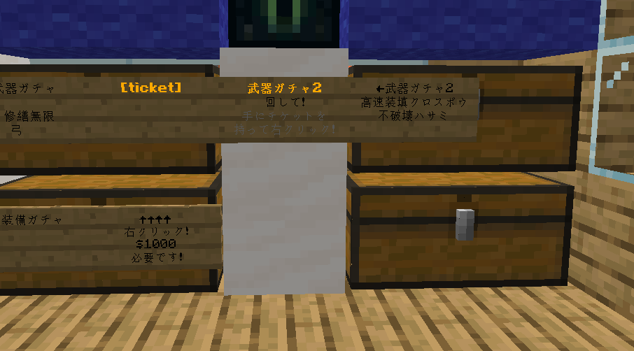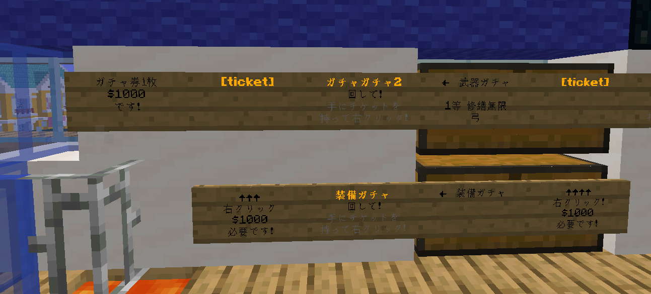 銀行の右側にあるガチャの上部分、武器系のアイテムが景品になっているガチャです。(コマンド /warp gacha_soubi で移動できます)