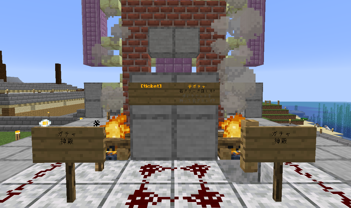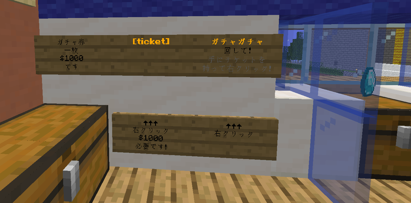 銀行の左側にあるガチャはアイテムや素材などが貰えるガチャです。(コマンド /warp gacha で移動できます)
