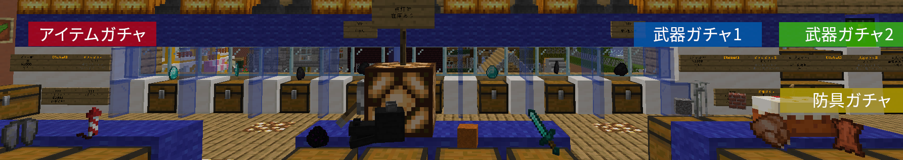 銀行の右側にあるガチャの上部分、武器系のアイテムが景品になっているガチャです。(コマンド /warp gacha_soubi で移動できます)